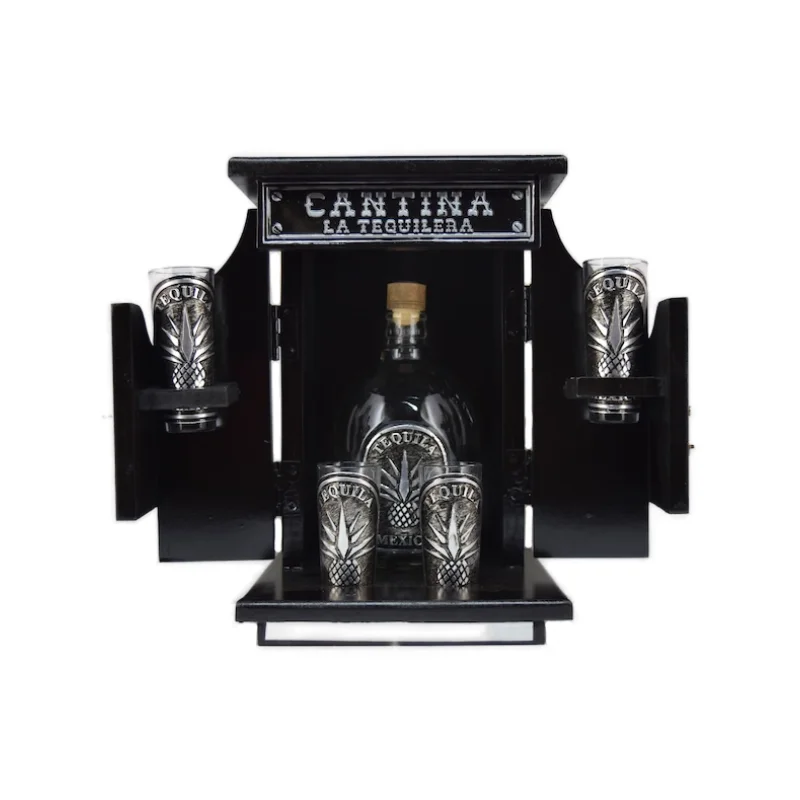 Cantina hecha con madera y accesorios de vidrio.